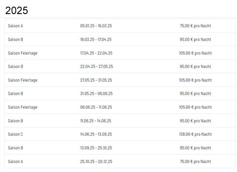 - Zusatzsaisonzeiten wie Ostern (06.04. bis 11.04.23),